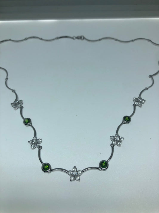 Vintage Handmade 925 Sterling Silver Chrome Diopside and Peridot Flower Necklace