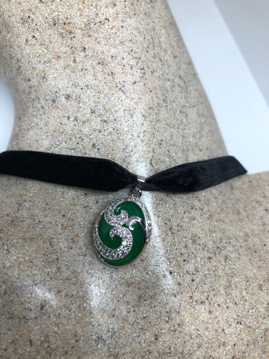 Vintage Green Jade Choker Silver Finish Necklace Pendant