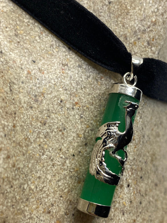 Vintage Green Jade Choker Silver Finish Dragon Necklace Pendant