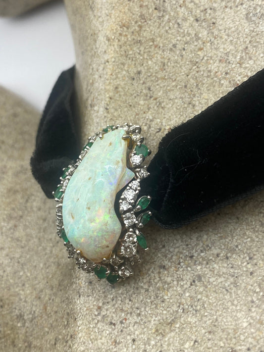 Vintage White Fire Opal Diamond Emerald 14k White gold Choker Necklace