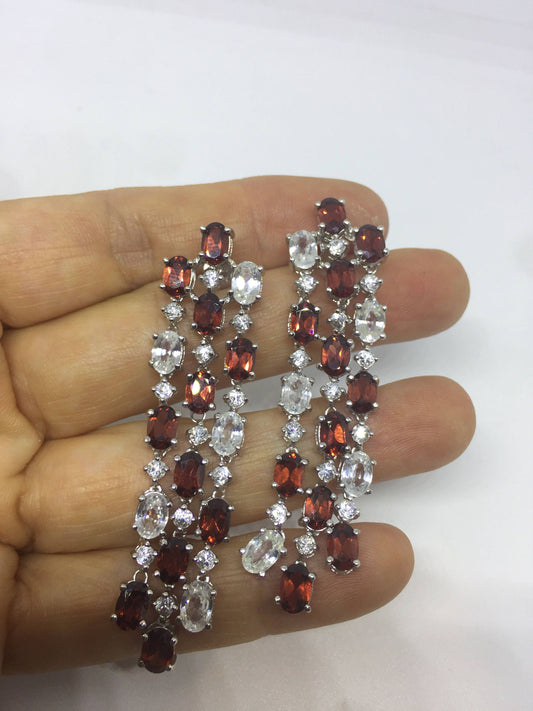 Vintage Red Garnet Earrings Cubic Zirconia 925 Sterling Silver Chandelier Dangle