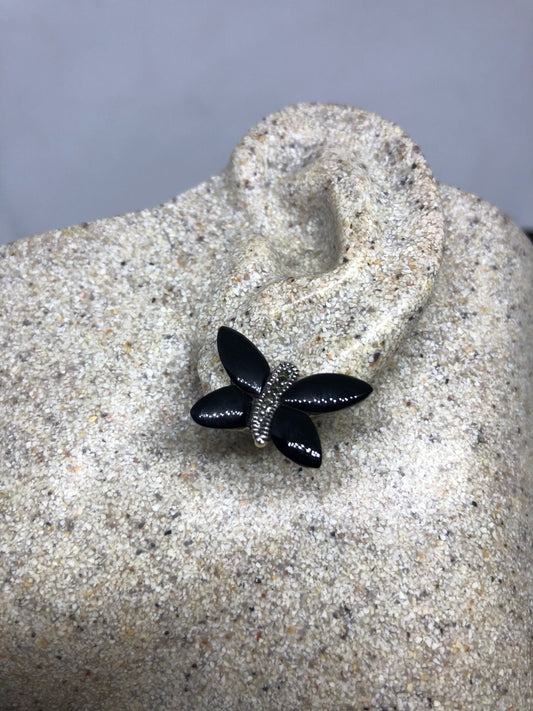 Vintage Black Onyx Dragonfly Earrings Marcasite 925 Sterling Silver Studs