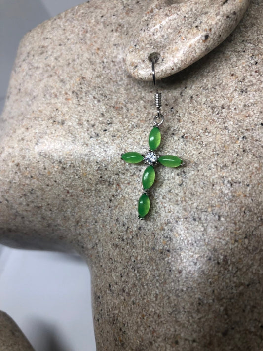 Vintage Fun Green Jade Gemstone Cross Silver Earrings