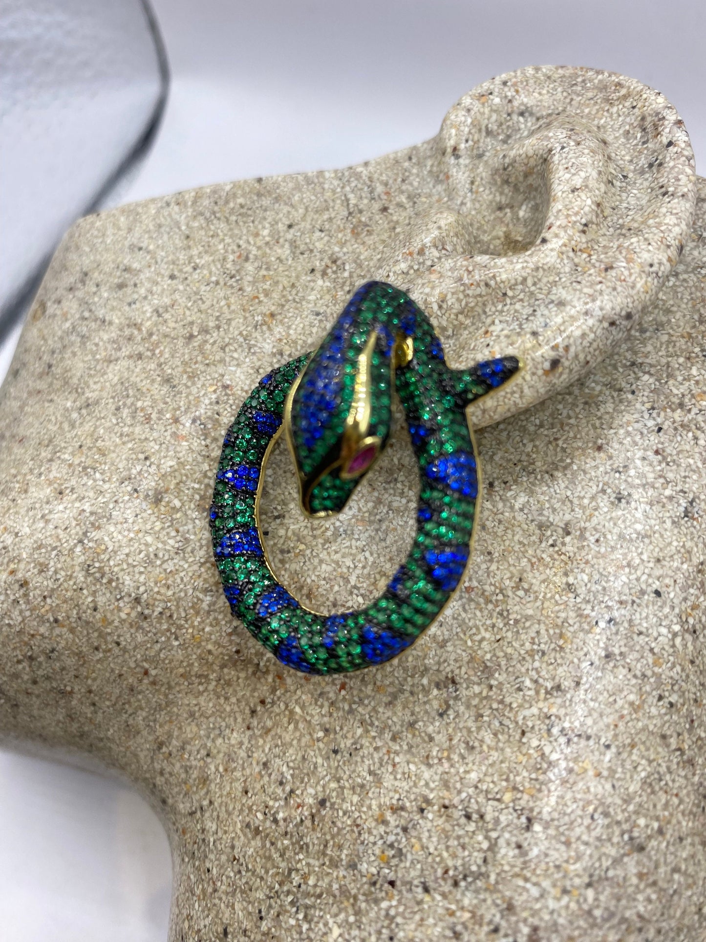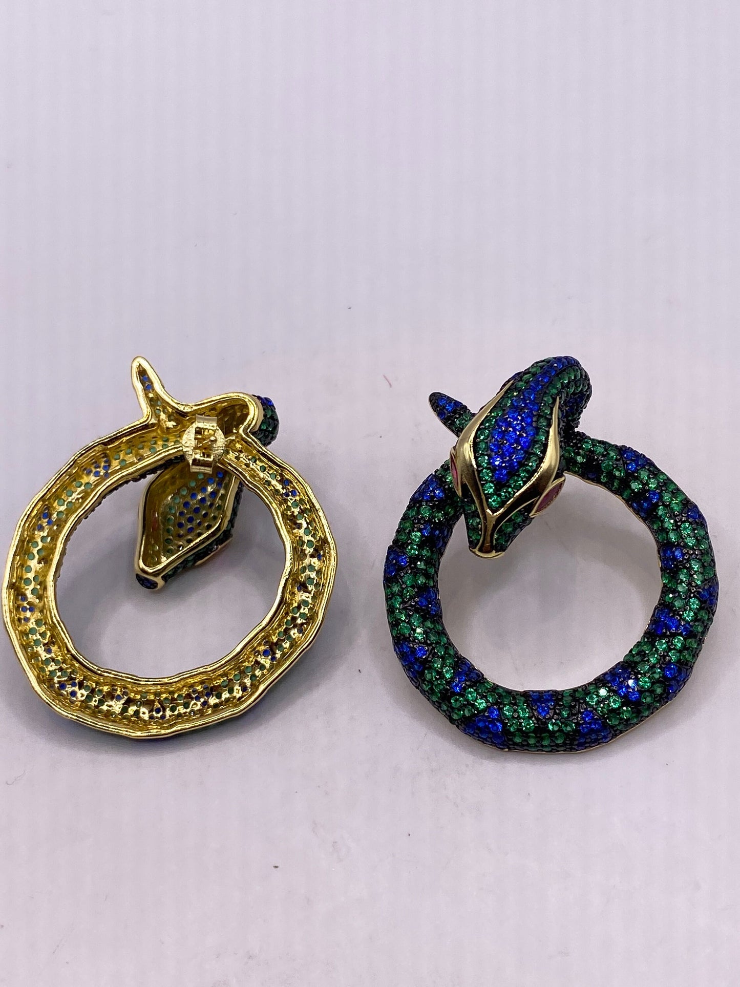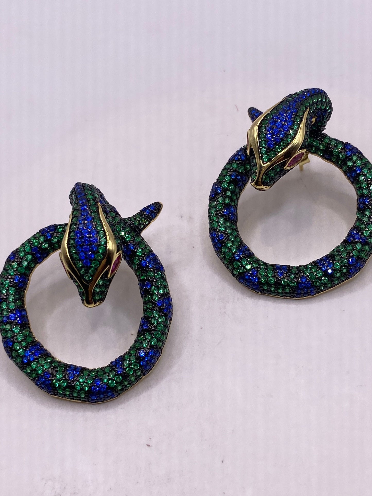 Vintage Green, blue and pink ruby crystal Snake Earrings golden 925 Sterling Silver