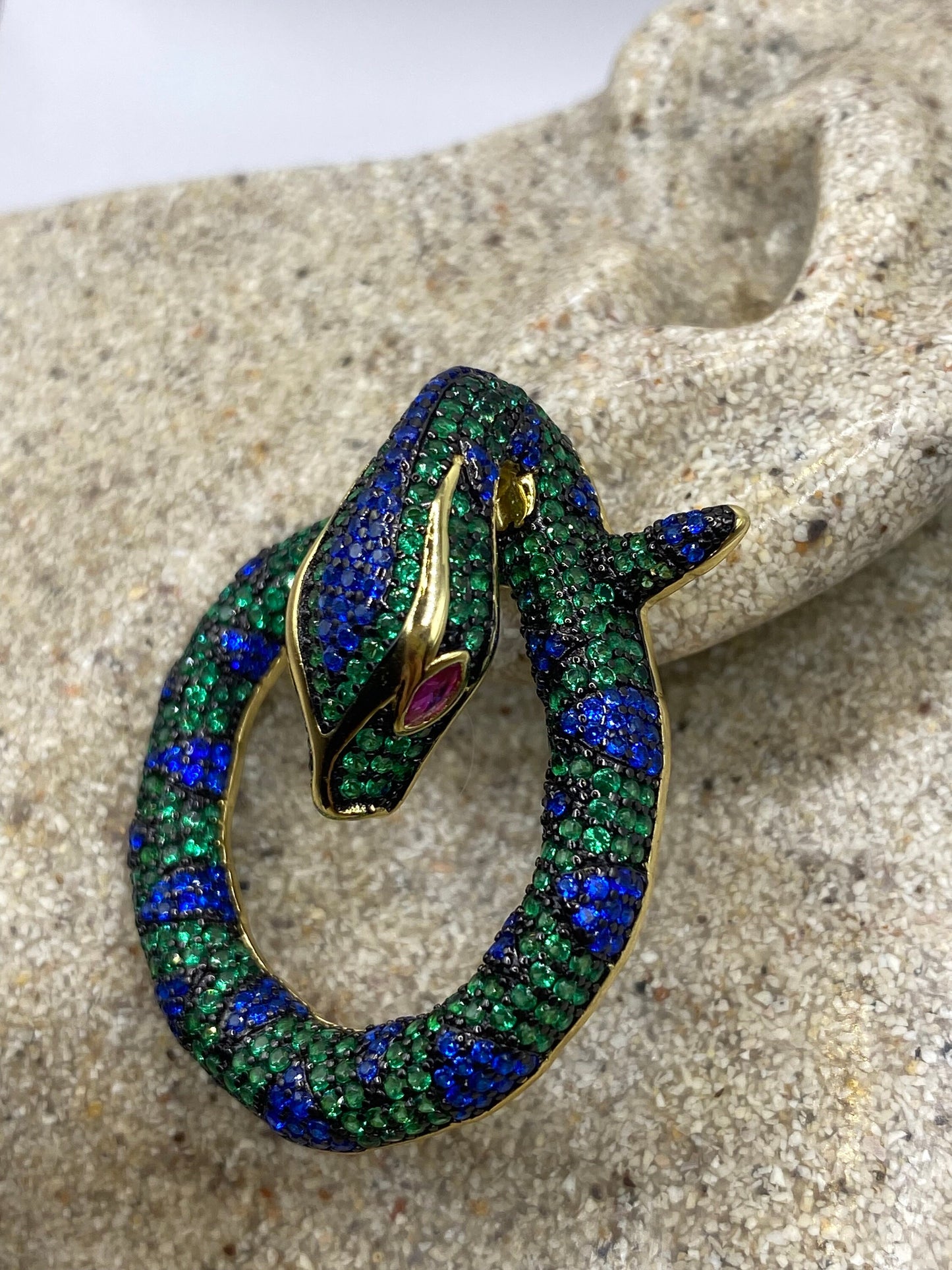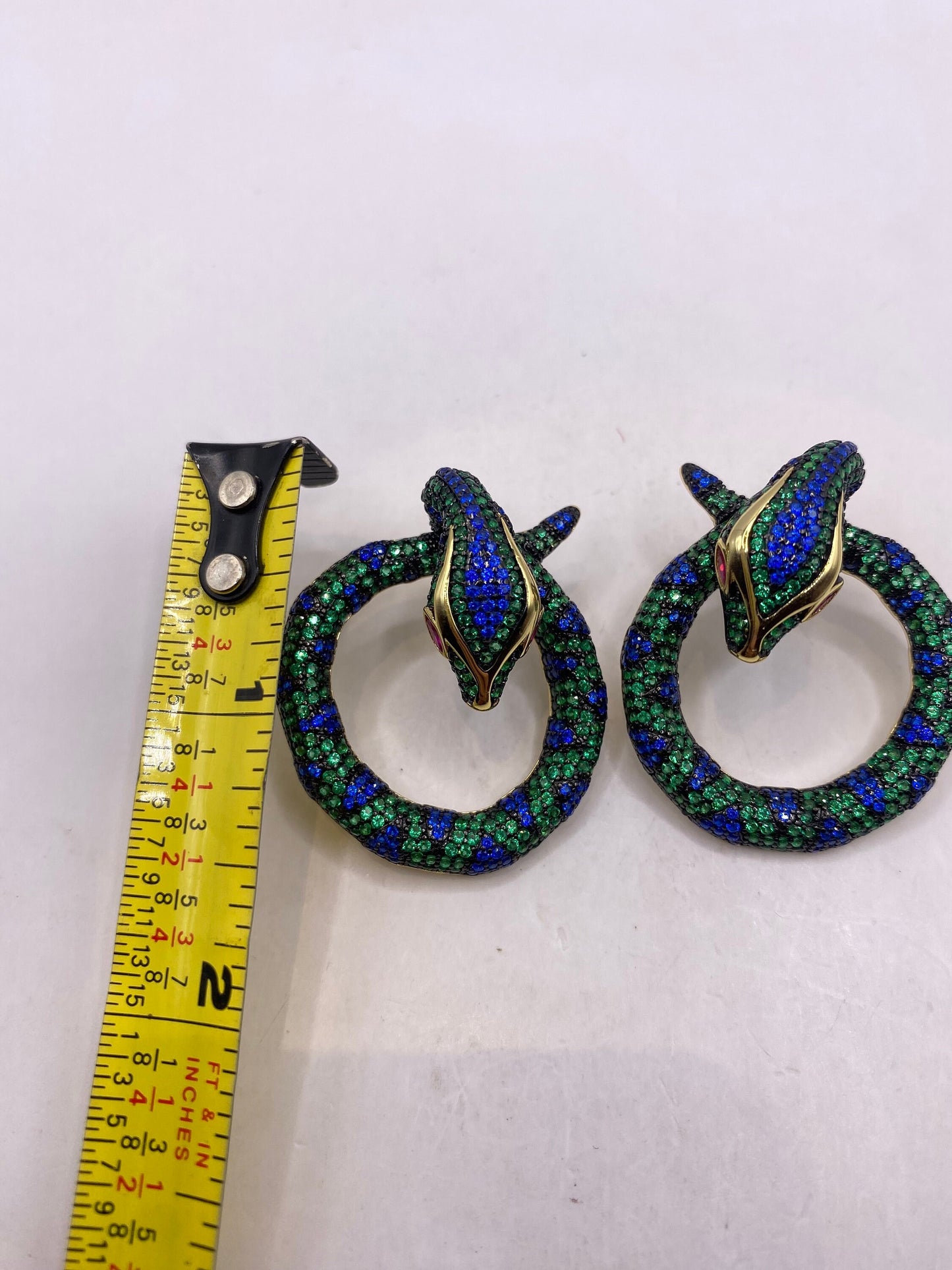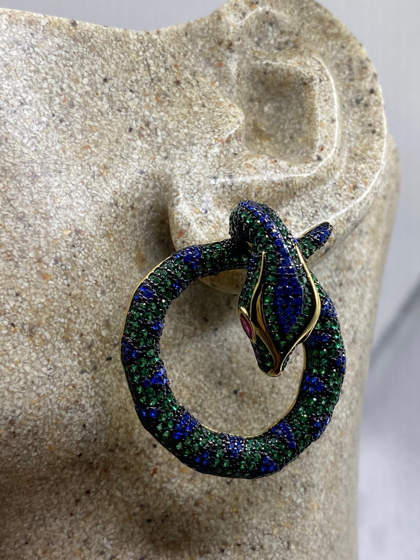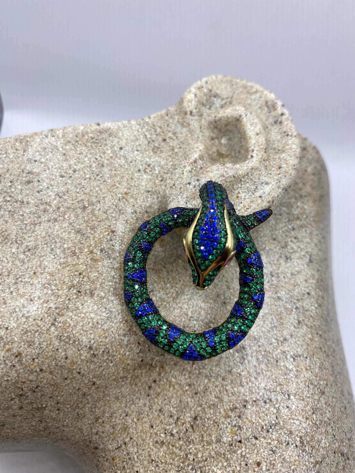 Vintage Green, blue and pink ruby crystal Snake Earrings golden 925 Sterling Silver