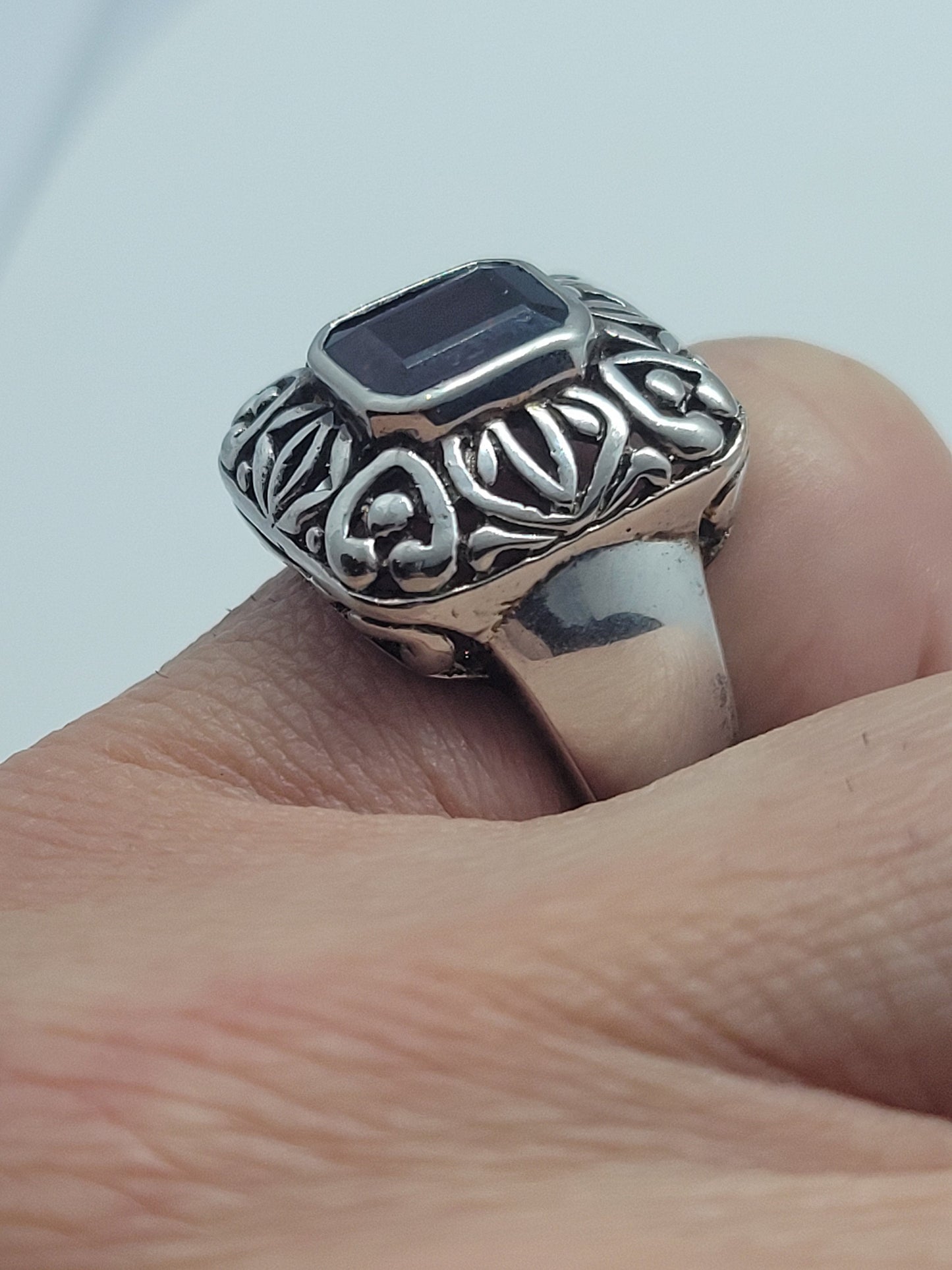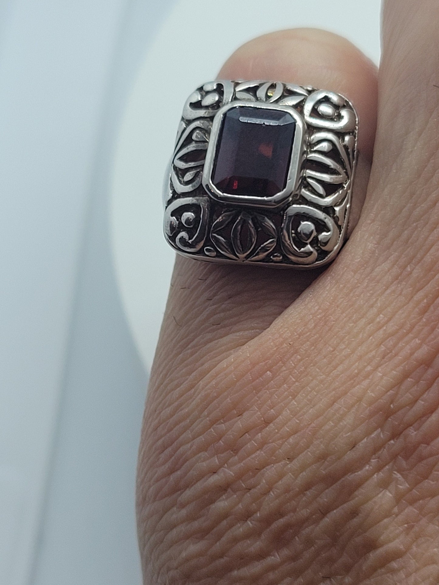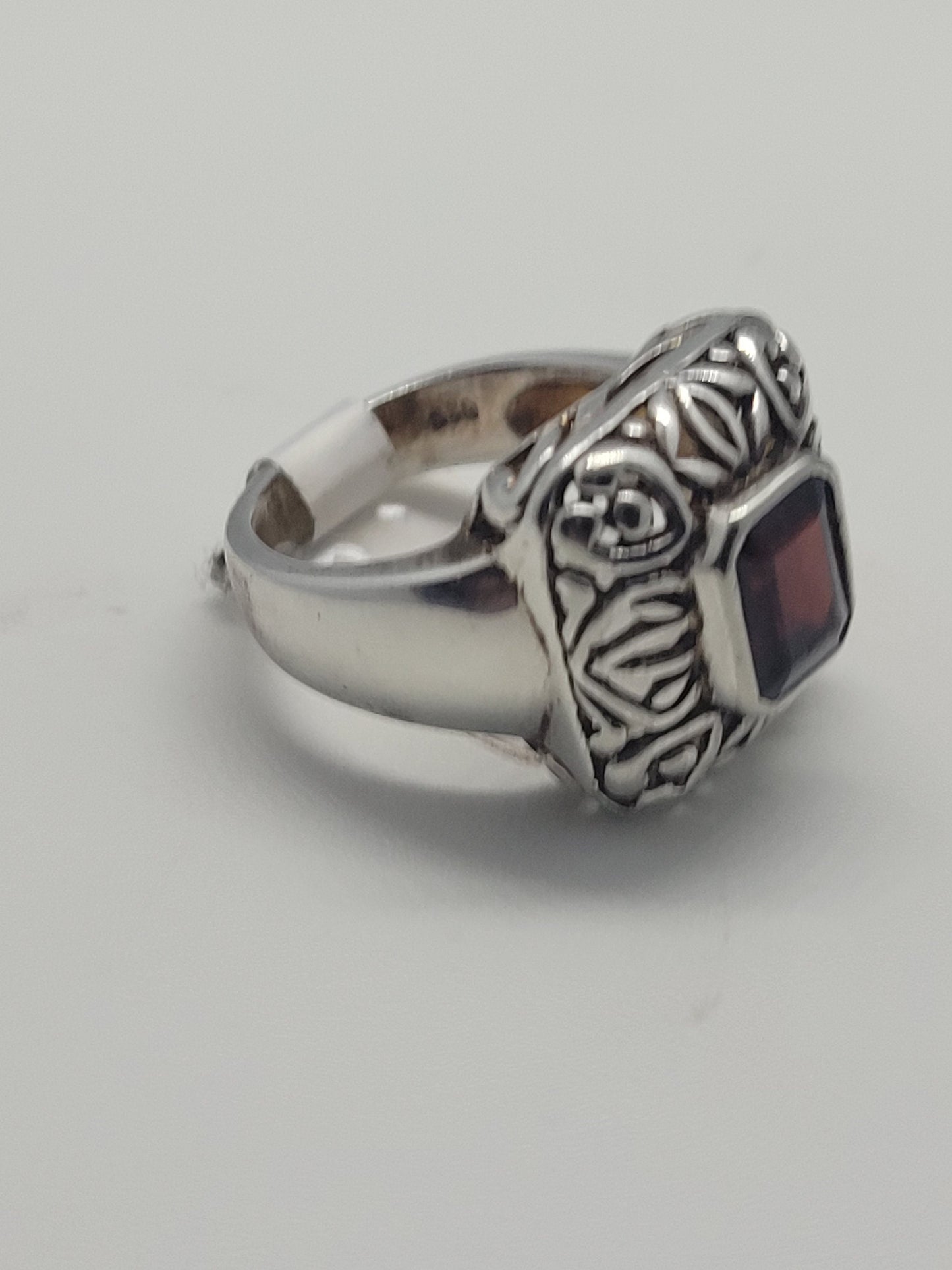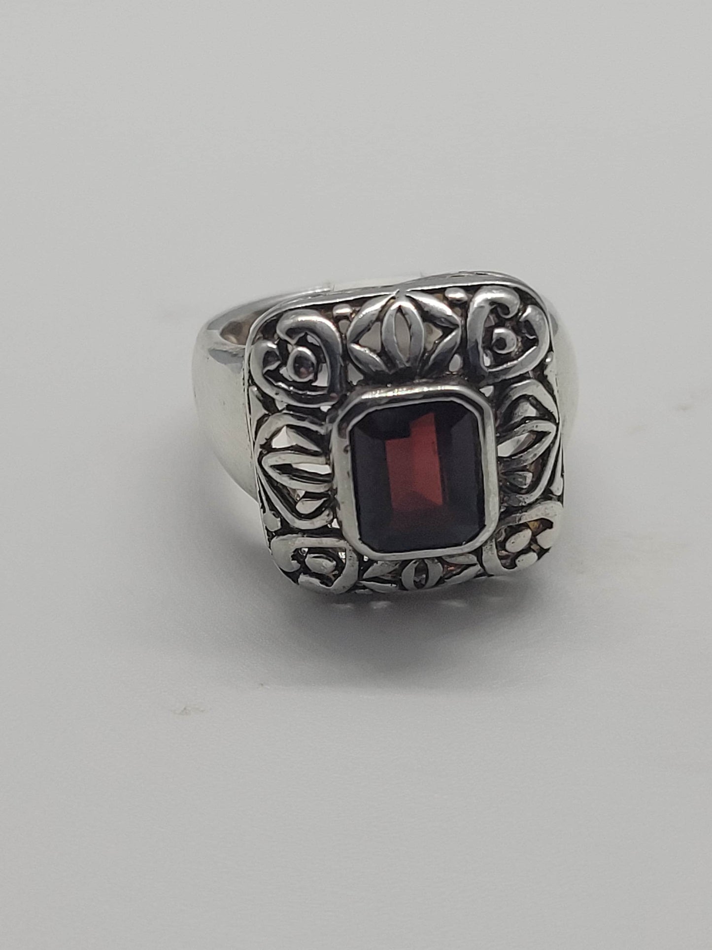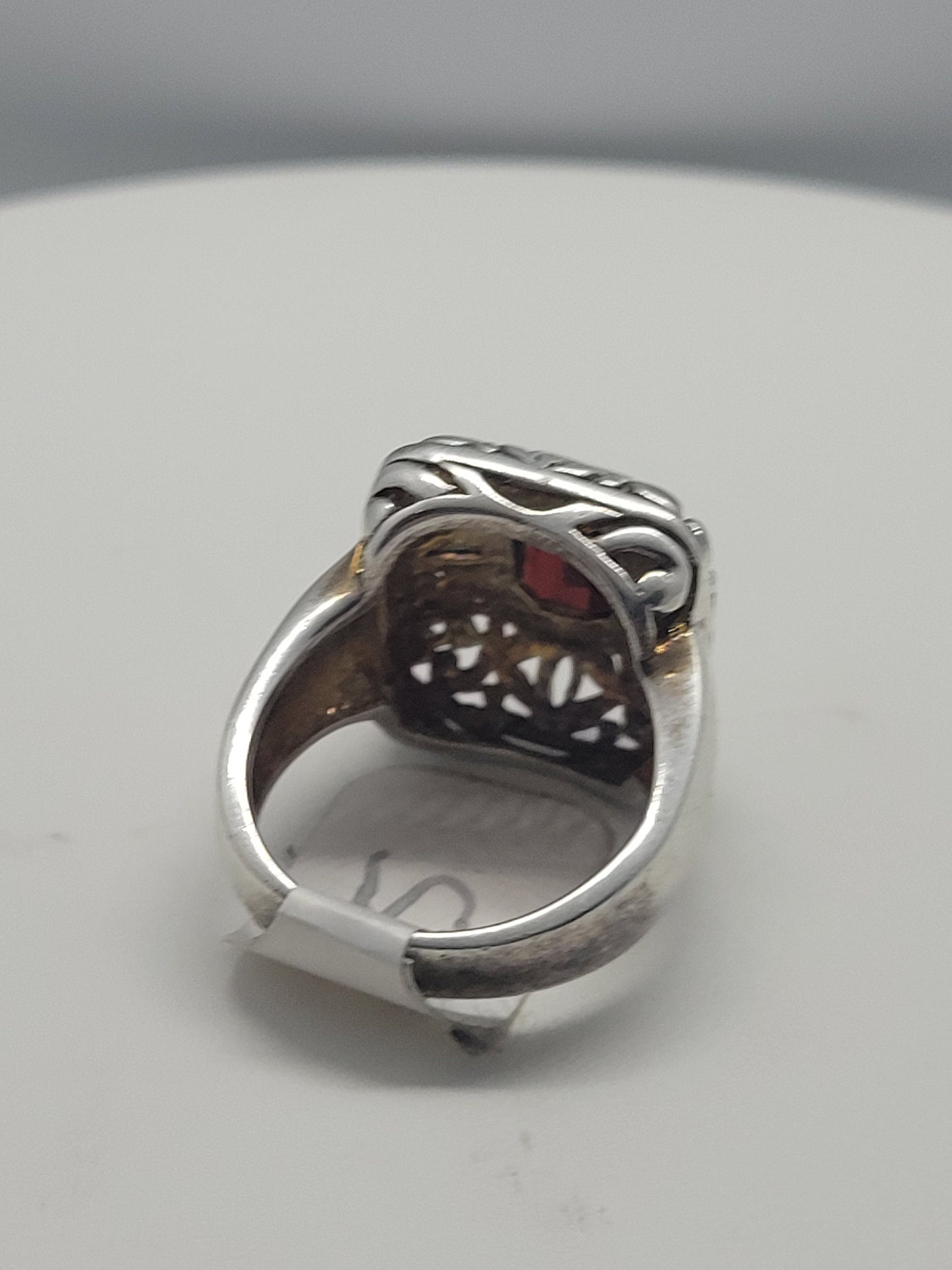 This ring features a faceted red garnet measuring 6 mm x 8 mm in an elaborate 925 sterling silver filagree setting.