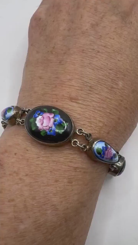 Vintage handpainted flowers porcelain Bracelet 925 Sterling Silver USSR
