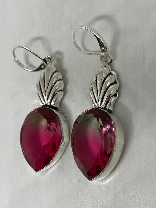 Antique Vintage Pink Butterfly wing Glass Silver Dangle Earrings