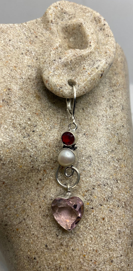 Vintage Rose Quartz Heart Sterling Silver Lever Back Dangle Earrings