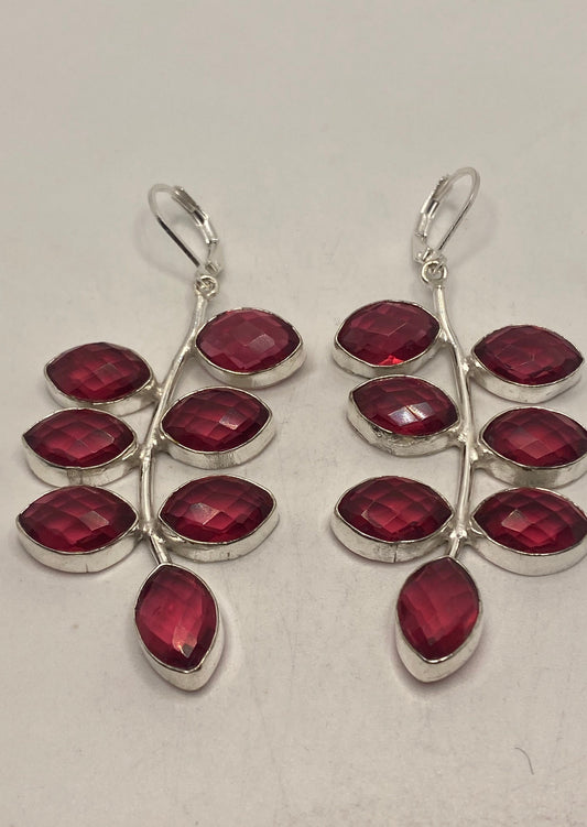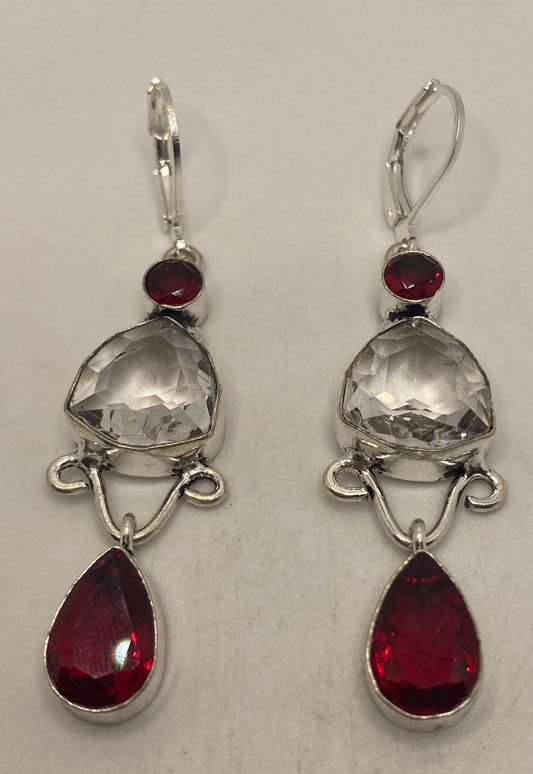Vintage Red Ruby Glass clear quartz earrings 925 Sterling Silver Leverback