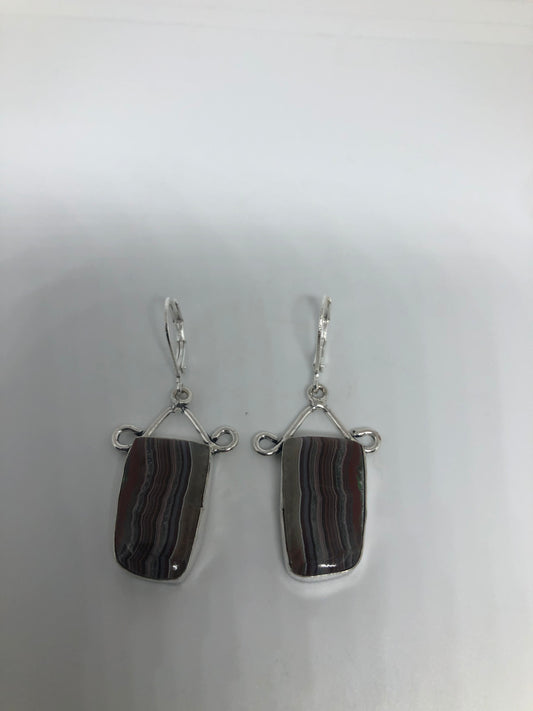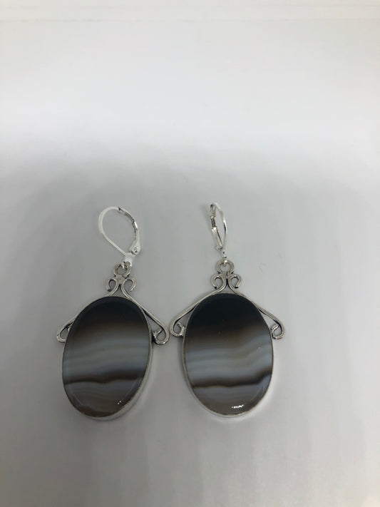 Antique Vintage Black Agate Striped Onyx Silver Dangle Earrings