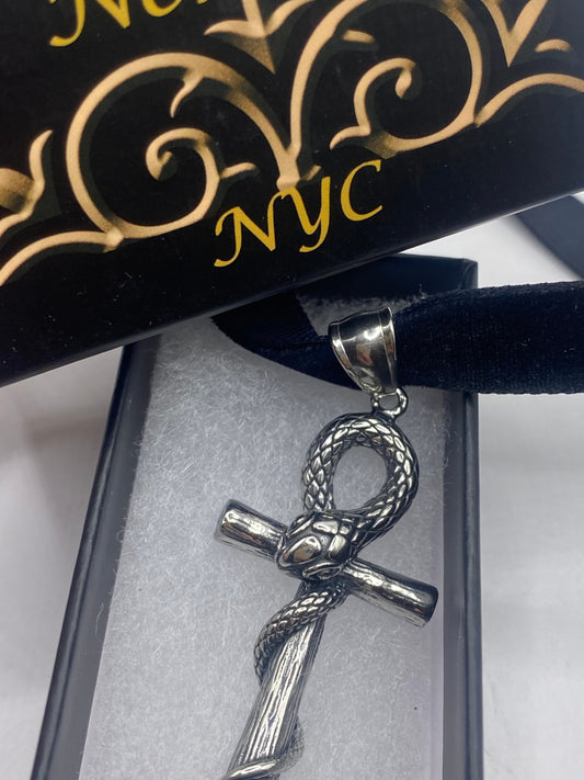 Vintage Stainless Steel Snake Ankh Pendant Necklace