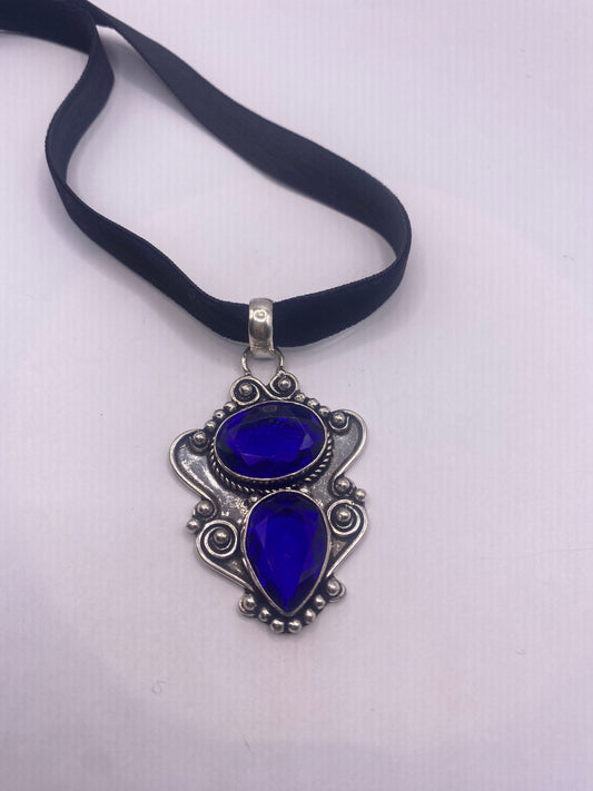 Vintage Indigo Blue Glass Black Velvet Choker Necklace