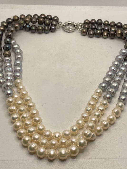 Vintage Hand Knotted Grey Cream Pearl Triple 18 in Necklace