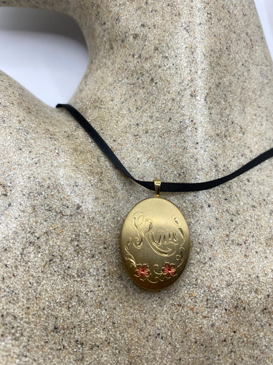 Vintage Flower Locket Choker Golden Stainless Steel Deco Etched Necklace