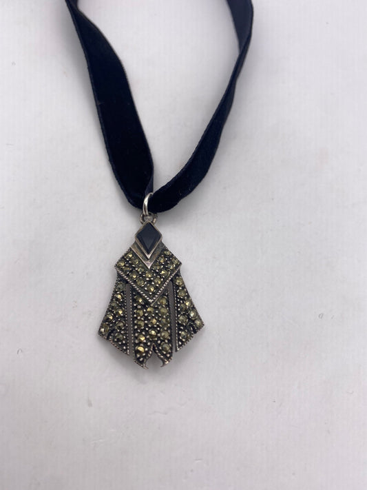 Vintage Black Onyx Marcasite Choker 925 Sterling Silver Deco Pendant Necklace