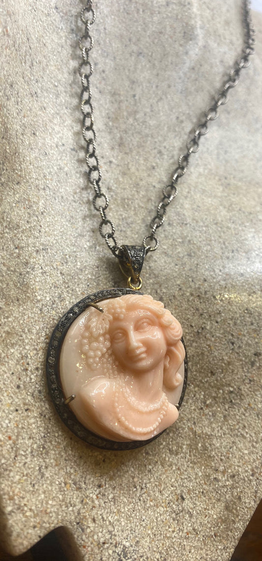 Vintage Pink Coral Cameo Diamond 925 Sterling Silver Necklace Choker