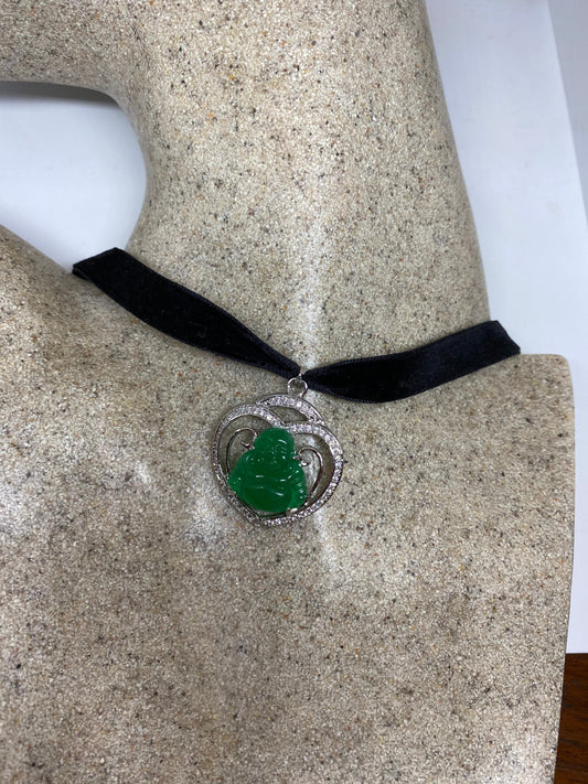 Vintage Green Jade Buddha Choker Silver Finish Necklace Pendant