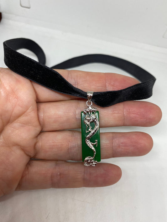 Vintage Green Jade Choker Silver Finish Dragon Necklace Pendant