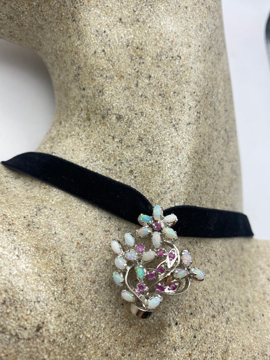 Vintage Fire Opal and Genuine Ruby 925 Sterling Silver Rhodium Brooch Necklace