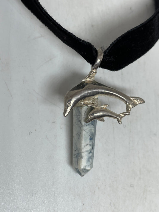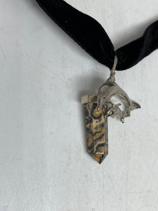 Vintage Dolphin Choker Fossil Agate 925 Sterling Silver Necklace