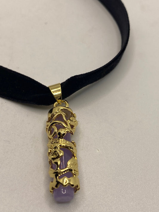 Vintage Lavender Jade Choker Gold Finish Dragon Necklace Pendant