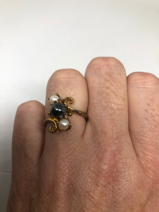 Vintage Genuine Pearl Hematite Golden 925 Sterling Silver Ring