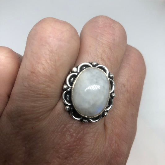 Vintage Large Blue White Rainbow Moonstone Stone Silver Ring