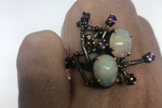 Vintage Handmade White Fire Opal Sterling Silver Black Rhodium Ring