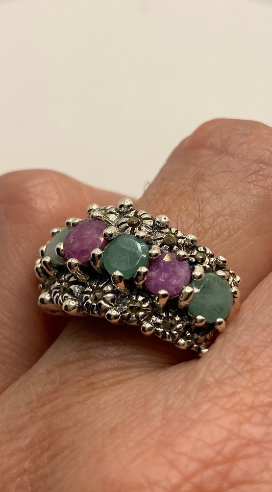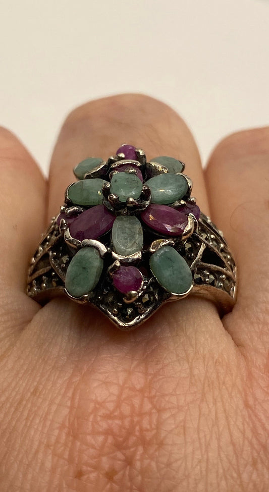 Vintage Green Emerald Ruby Marcasite 925 Sterling Silver Cocktail Ring