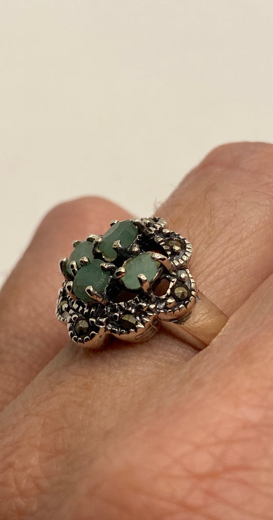 Vintage Green Emerald Marcasite 925 Sterling Silver Cocktail Ring