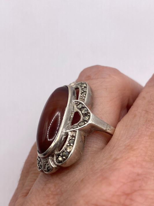 Vintage Genuine Red Carnelian 925 Sterling Silver Marcasite Ring