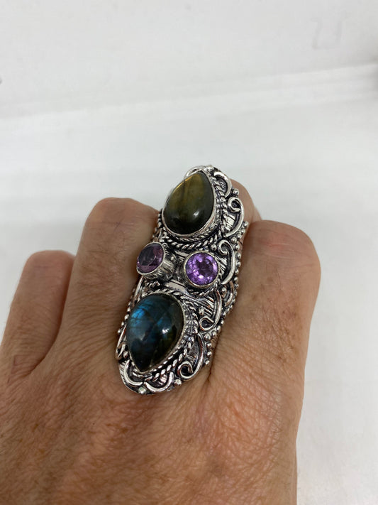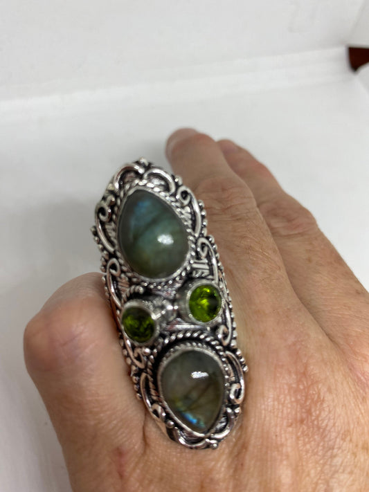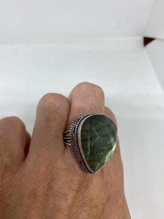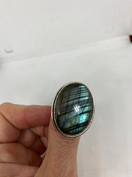 Vintage Large Blue Green Labradorite Stone Silver Ring