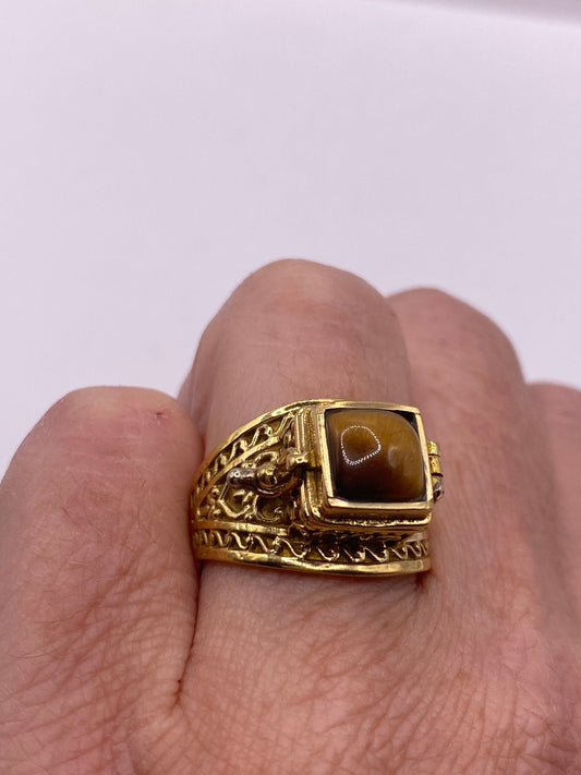 Vintage Gold Tigers Eye Brass Poison Pillbox Ring