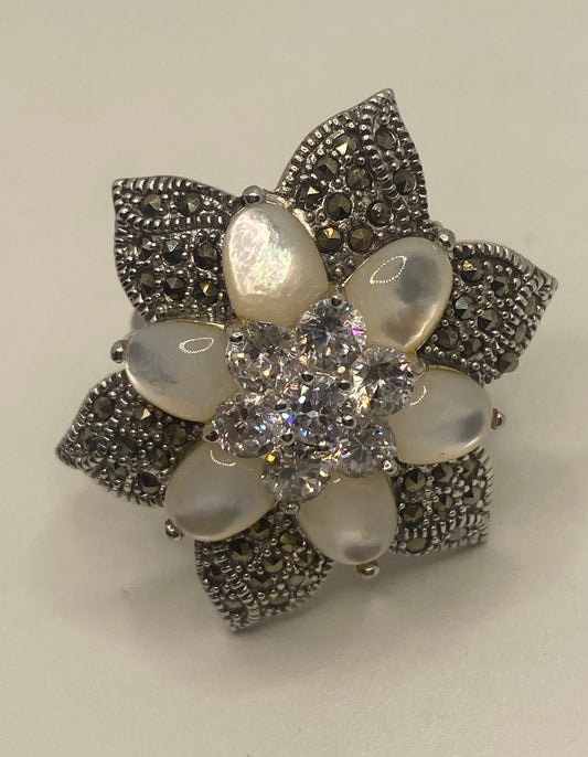Vintage Mother of Pearl 925 Sterling Silver Marcasite Flower Ring