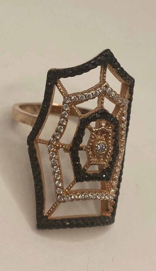 Vintage Spider Web Bohemian Black Jet 925 Sterling Silver Antiqued Rose Gold Finish Ring