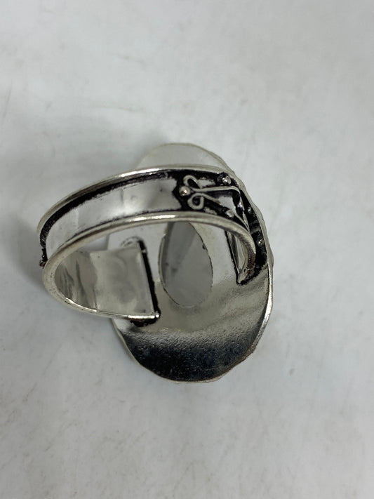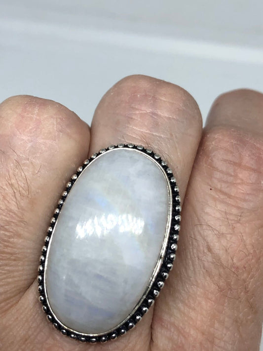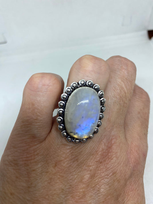 Vintage Large Blue White Rainbow Moonstone Stone Silver Ring