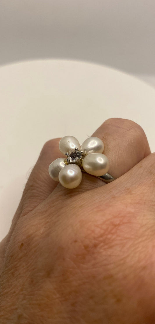 Vintage Pearl Flower Adjustable Silver Ring