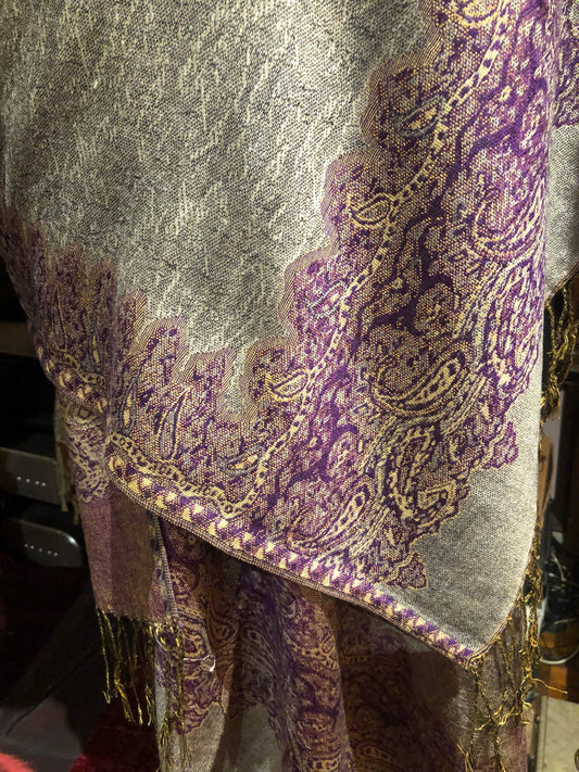 Vintage Gray Purple Paisley Brocade Pashmina Scarf Wrap Shawl