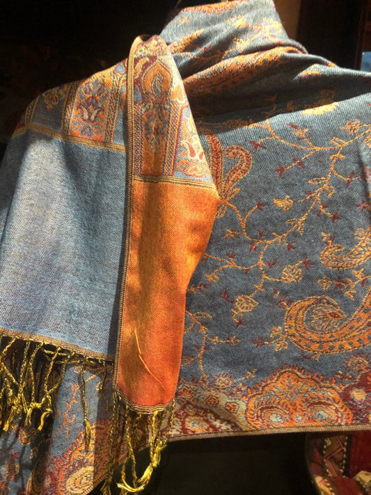 Blue Orange Vintage Paisley Brocade Pashmina Scarf Wrap Shawl