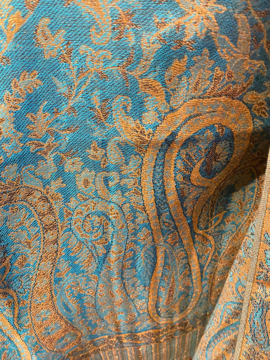 Vintage Blue Gold Paisley Brocade Pashmina Scarf Wrap Shawl