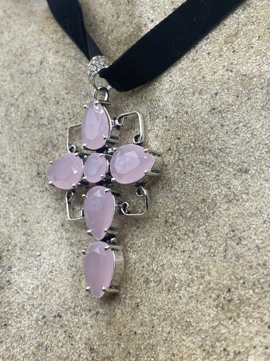 Vintage Handmade Silver Finish Rose Quartz Cross Choker Pendant