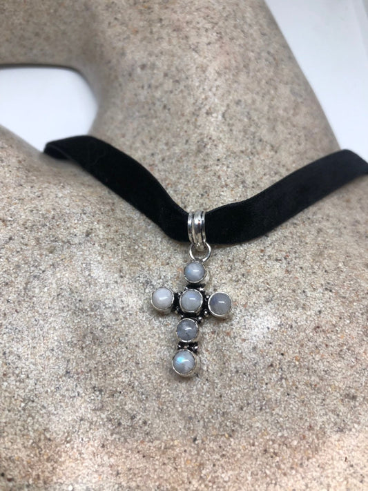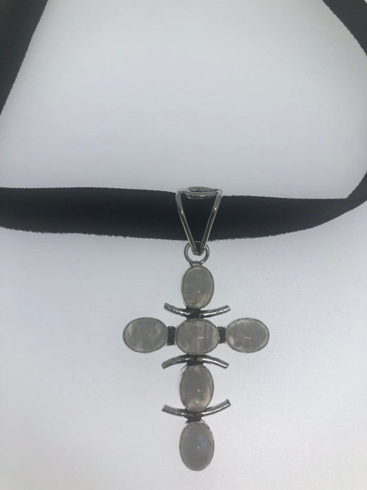 Vintage Rainbow Moonstone Cross Choker White Bronze Pendant
