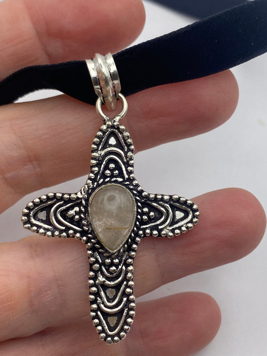 Vintage Rutile Quartz Bronze Silver Cross Pendant