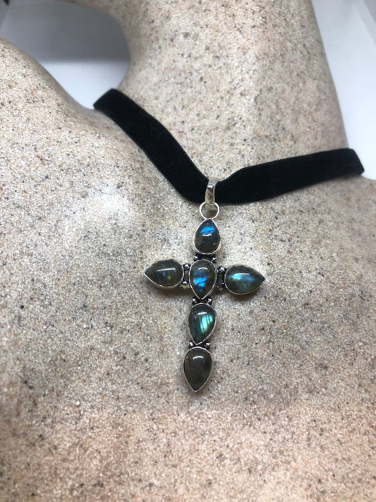 Vintage Silver Genuine Labradorite Gemstone Cross Necklace.