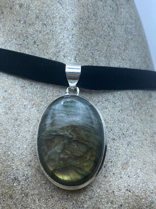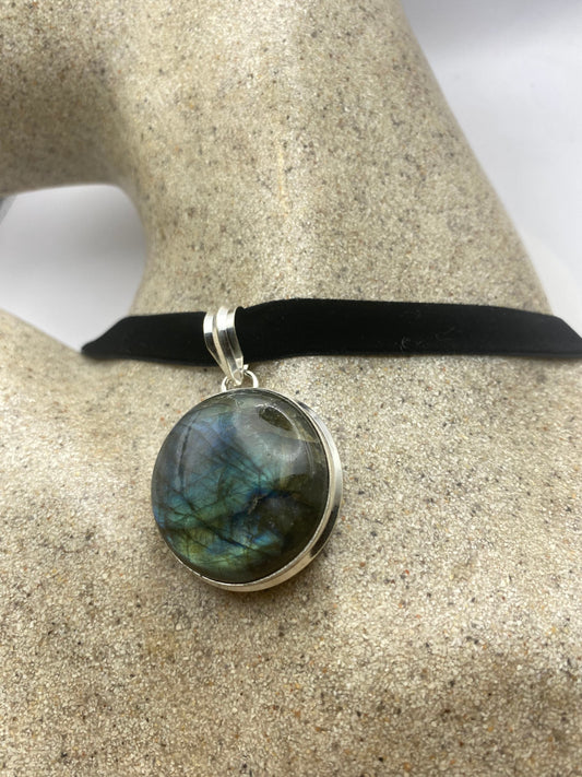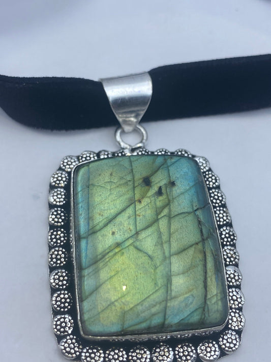 Vintage Silver Genuine Rainbow Labradorite Choker Black Velvet Necklace.