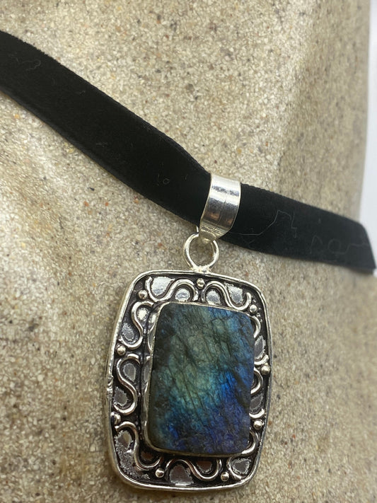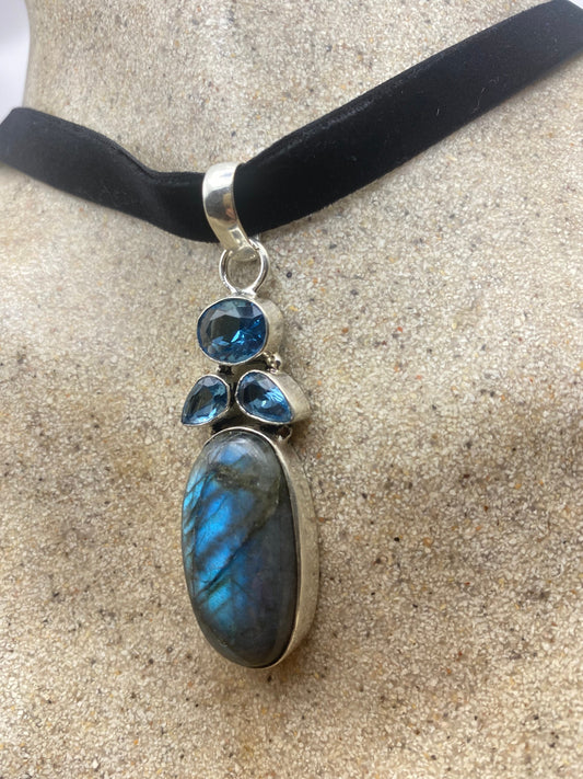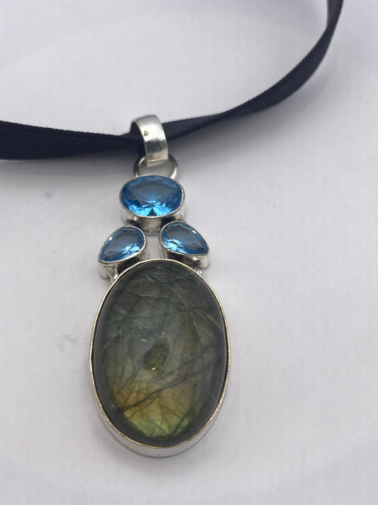 Vintage Silver Genuine Rainbow Labradorite Blue Topaz Choker Black Velvet Necklace.
