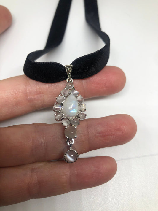 Vintage 925 Sterling Silver Rainbow Moonstone Pendant Necklace Choker