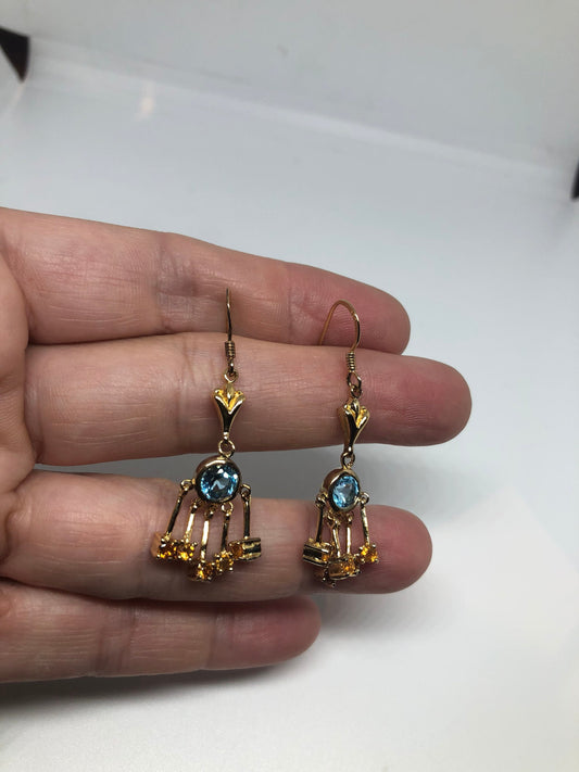Vintage Blue Topaz Citrine Gemstone Sterling Silver Dangle Earrings