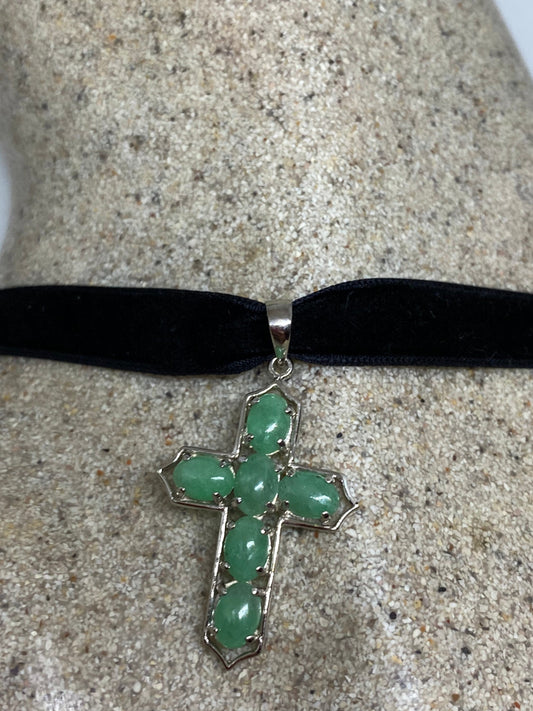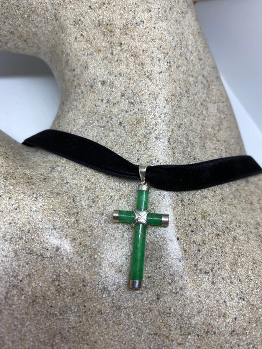 Vintage Fun Jade Choker 925 Sterling Silver Cross Pendant Necklace